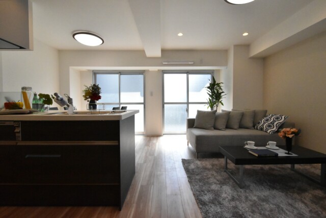麻布狸穴ナショナルコート 光が射し込むLDK 麻布狸穴ナショナルコート 真っ白なカウンターキッチン