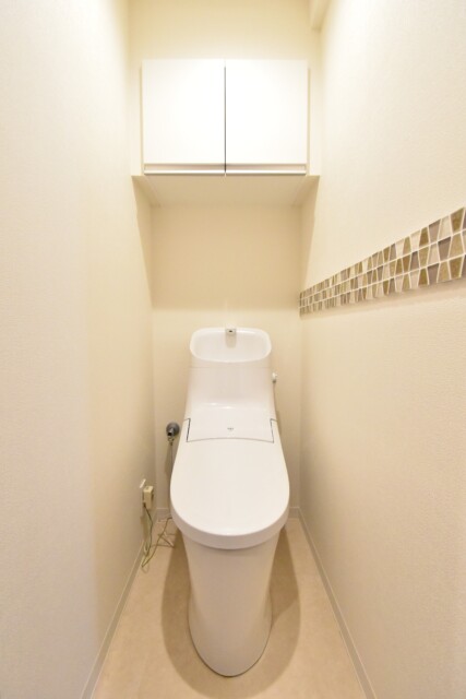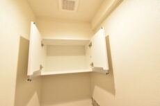 真っ白なトイレはいつもピカピカでいたいですね。吊戸棚にはトイレットペーパーのストックに良いですね。