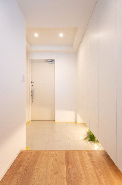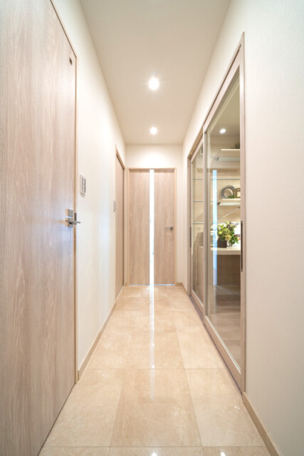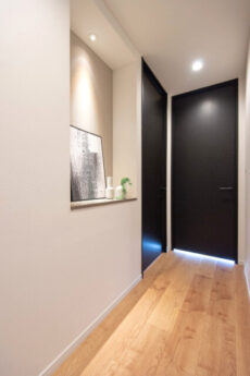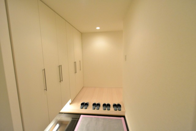 広い玄関から廊下にかけては天井高の収納がズラリと並んでいます。玄関側扉4枚分はシューズボックス、残り4枚が収納。把手などがなく収納力がありながら収納を感じさせないさりげなさが素敵です。通常はリビングなどで見かける折上天井が玄関に施されているのも贅沢ですね。