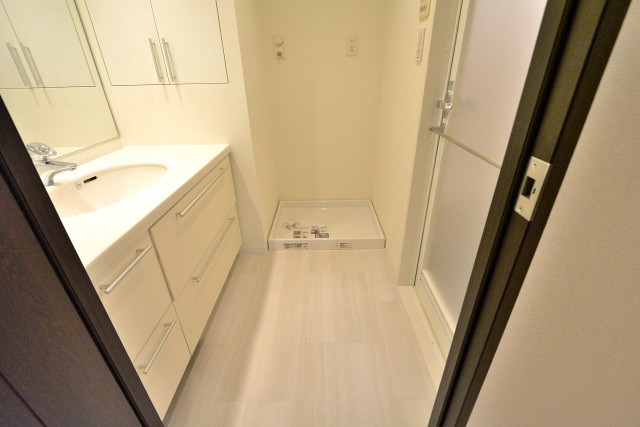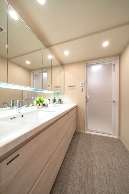 洗面化粧台は幅があって混雑しがちな時間帯でも安心です。