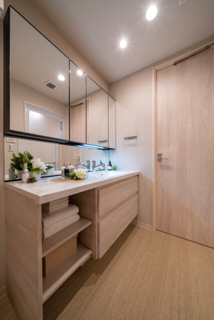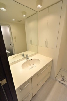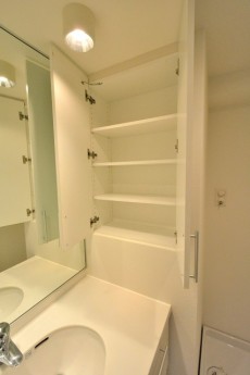 洗面台の下と、さらに左手には背丈より大きな収納と化粧品や整髪料などを置ける棚が設置してあります。
