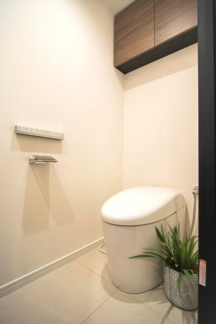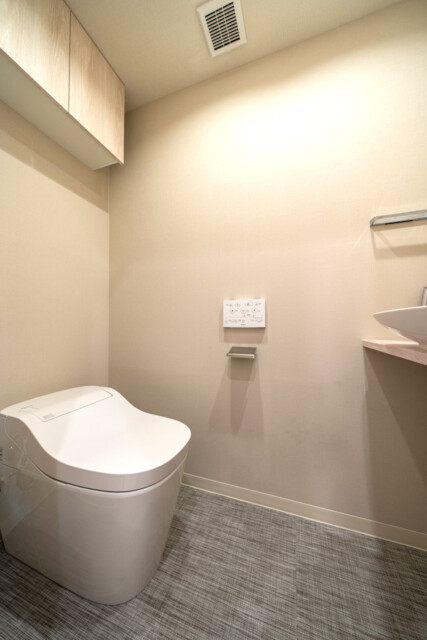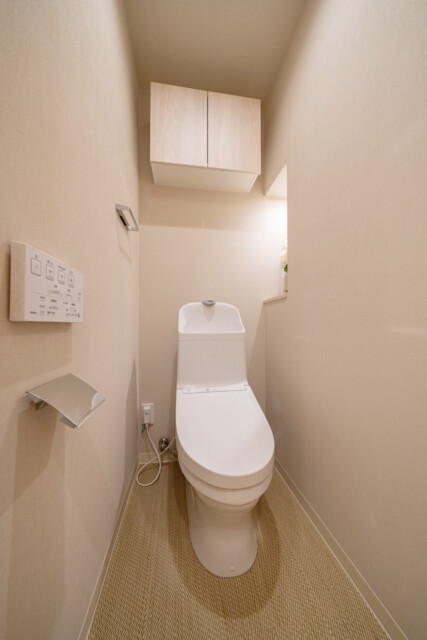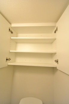 トイレは勿論ウォシュレット付、天井には吊戸棚も設置させているので、もうトイレットペーパーや洗剤の収納場所には困りません。
