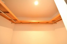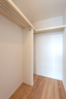お部屋の西側にはウォークインクローゼットがあります。ドアを開けると、コの字型に天板とハンガーパープが設置されていて、とても広く収納力のあるお部屋でした。