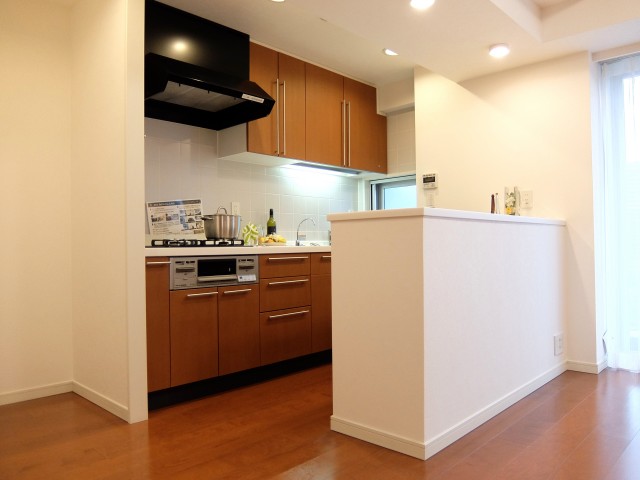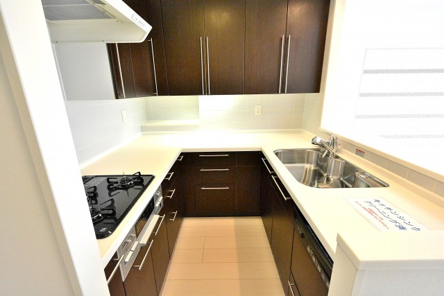 キッチンはL字のカウンタータイプ。解放感がありリビングダイニングとの一体感が特徴です。コンロ前が壁になっているので油跳ねなど気にせずに思いっきり鍋を振るえますよ。みんなの憧れ食器洗浄乾燥機付き!