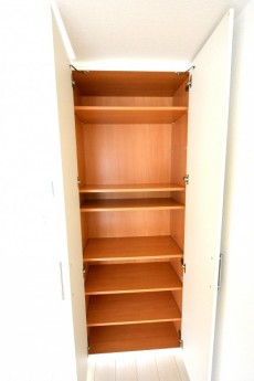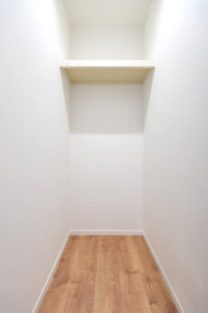 廊下を進むと、大きな収納棚がありました。棚板は一枚なので、外して背の高い物を入れる物置としてもお使い頂けます。
