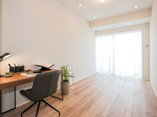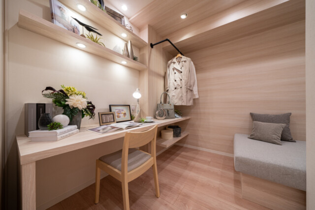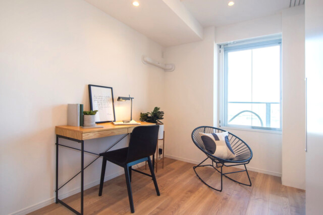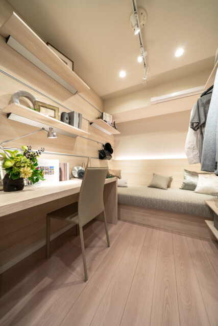 デスク、ソファーベッド、オープンクローゼットが設置されたお部屋。DENとはなっていますが、これはもう住めますよね(笑)小さいお子さんなら絶対ここを欲しがると思いますよ。書斎にしたいお父さんとお子さんの戦いに?問題はガラス張りによるプライバシーですが、ロールカーテンかフィルムで解決できそうです。
