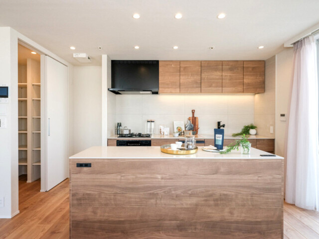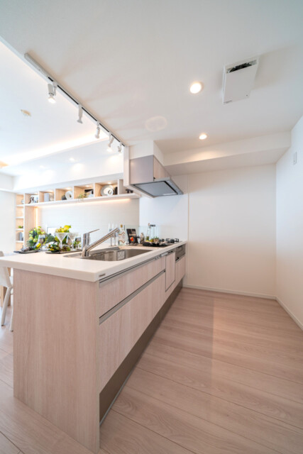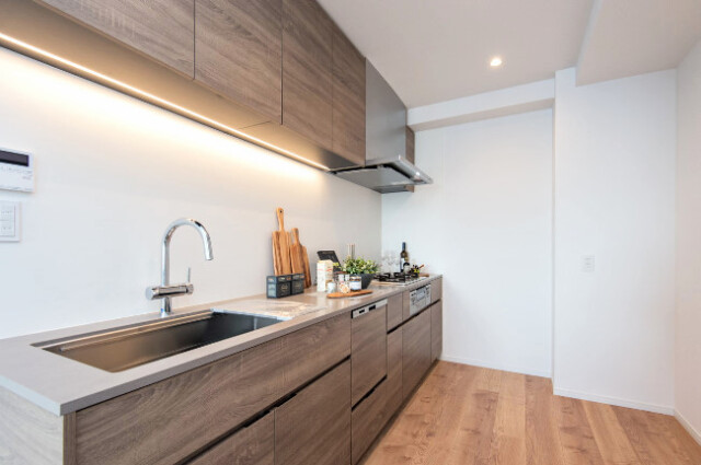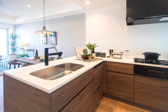 お料理をしながらでもご家族とのコミュニケーションがとりやすいのが人気の理由です。生活感のあるキッチン内が、寛ぎのスペースから目立たないのもいいですよね。食器洗浄乾燥機や浄水機能一体型水栓など、アシスト機能もしっかりと完備されたキッチンです。