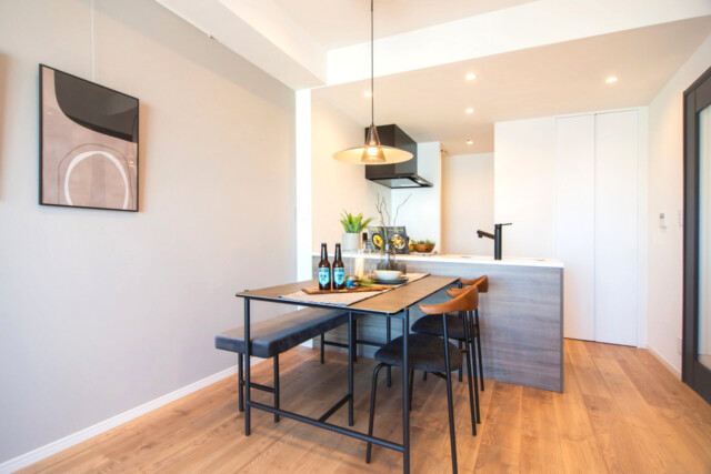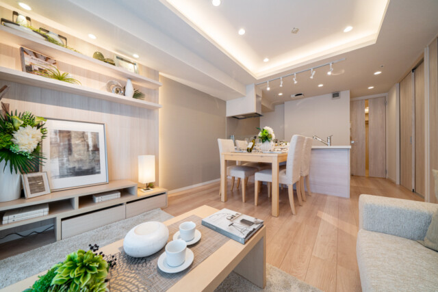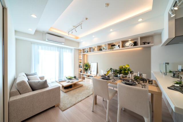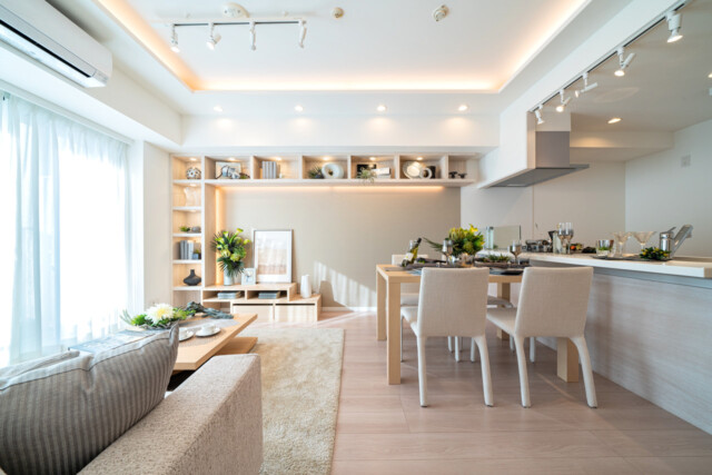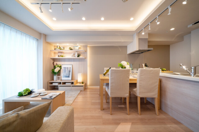 リビングダイニング部分は折り上げ天井。陰影によって奥行のある広がりを感じさせてくれます。夜になれば設置された間接照明からの光がお部屋全体を優しく照らし、また違った雰囲気が期待出来そうですね。