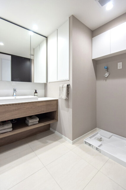 洗面台は大きな鏡に大きなカウンターが特徴的。右側には棚があるので、洗面台周りをスッキリとお使い頂けます。