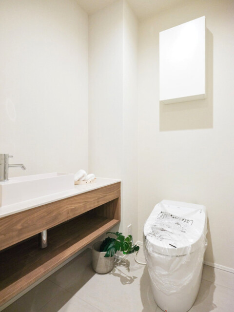 トイレはタンクレス&TOTO製の温水洗浄機能付き。タンクレスはスッキリ見えていいですよね!写真では見切れてしまっていますが、おしゃれな手洗いボウルも付いています。