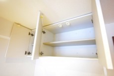 洗面化粧台は鏡の裏が一面収納になっており、ゴチャゴチャ散らかりがちなハブラシや洗顔フォームなどのアイテムもスッキリ整理整頓できそうです。
