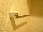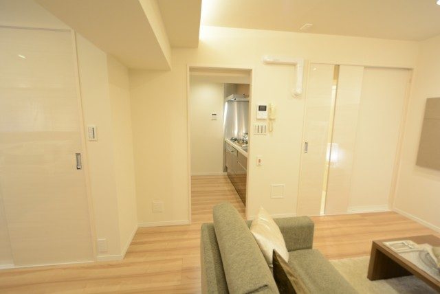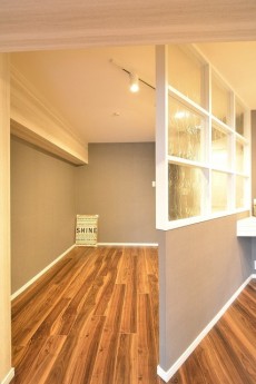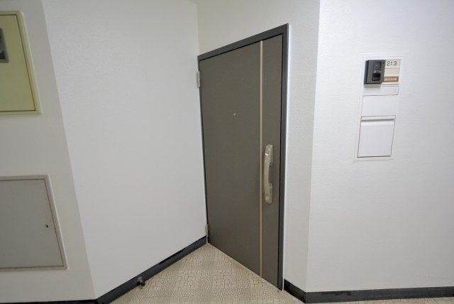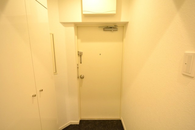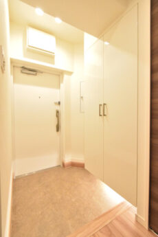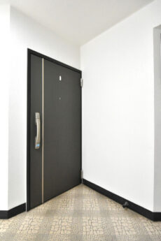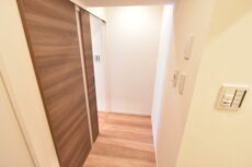 玄関は三角形のアルコーブ付き。廊下とは90°違う向きにドアが付いているんですね。廊下を通る人の目から玄関を隠し、プライバシー保護に一役買ってくれています。ドア横にはモニター付きインターホンが設置されていて、お部屋の中から訪問者を確認する事が可能。手が離せない時などにとても助かります。