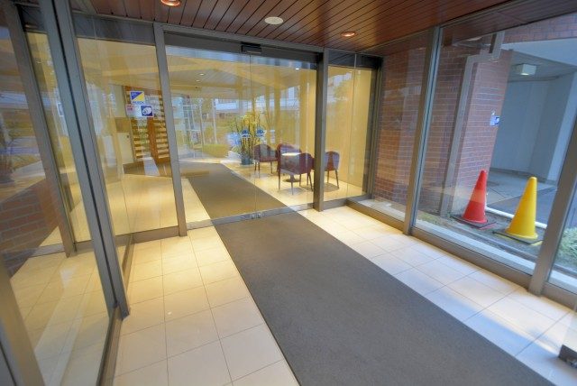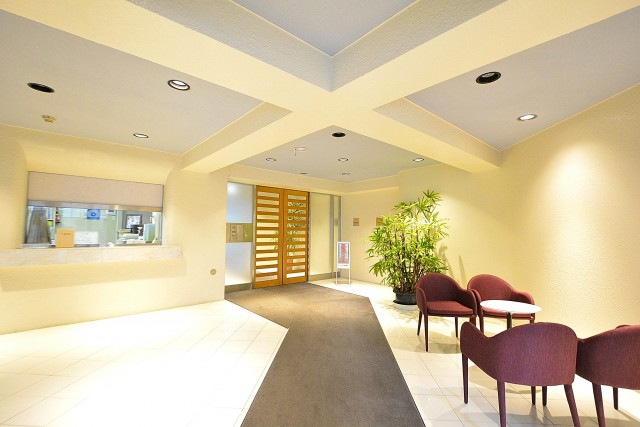 入口入って正面にオートロック、左には管理室があります。住み込みという安心感バッチリの管理体制です。