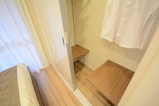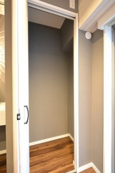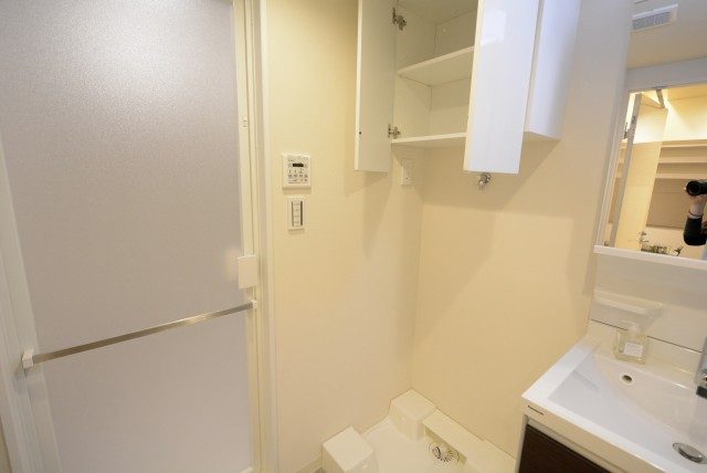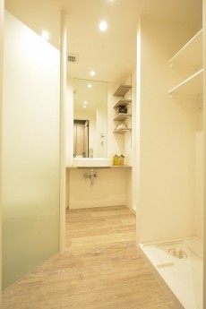 右側にある洗濯機置き場です。左側にある収納棚に洗剤など置いておければ使い勝手も良いですね。浴室に入る際、お向かいにある洗濯機に洋服をポイッと入れ、洗濯をまわす~一石二鳥ですね。