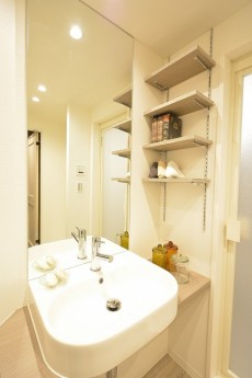 サニタリールームです。コンパクトではありますが、あると助かる収納棚があります。