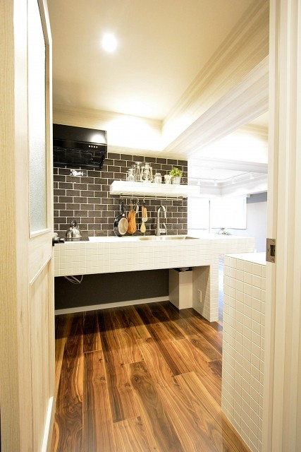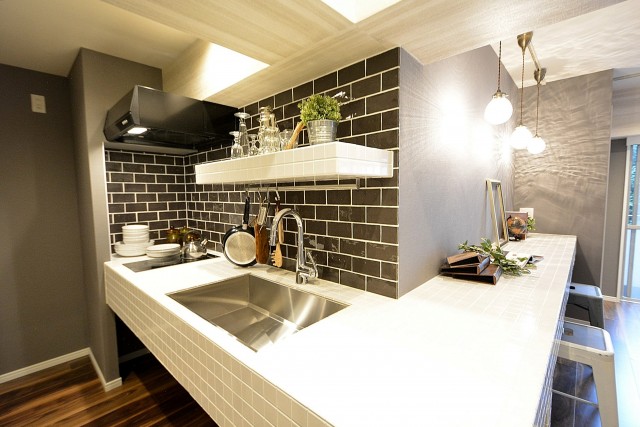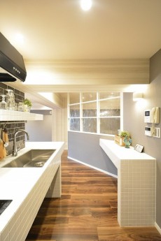 タイル張りのキッチンは下部のスペースには収納もできます。対面にはカウンターを設置。
