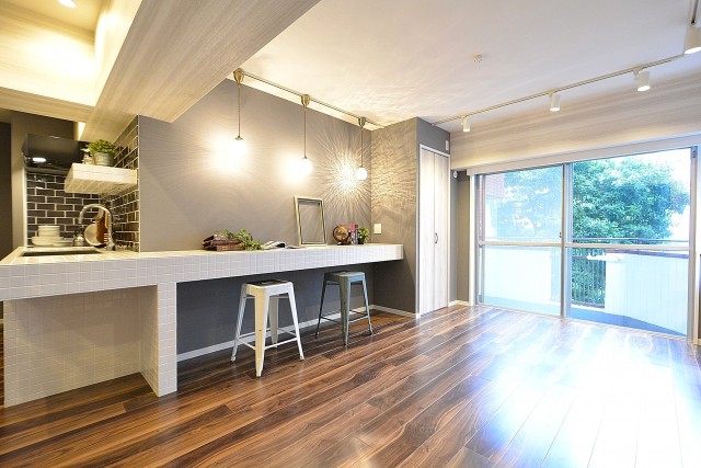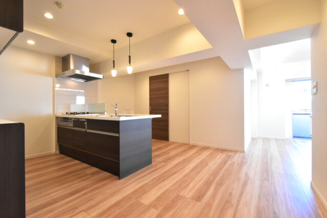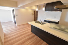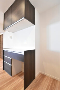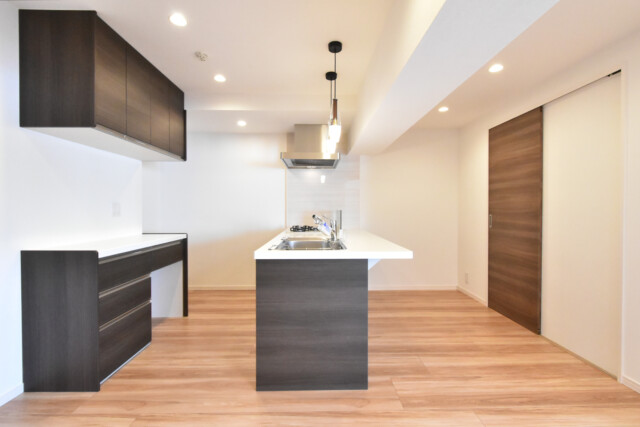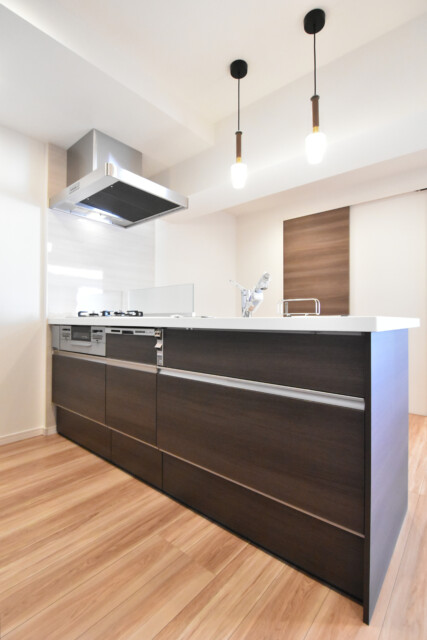 ダークブラウンのシステムキッチンは存在感があり、お部屋のアクセントにもなっています。幅があり作業スペースや収納も十分ですね。