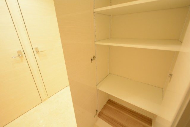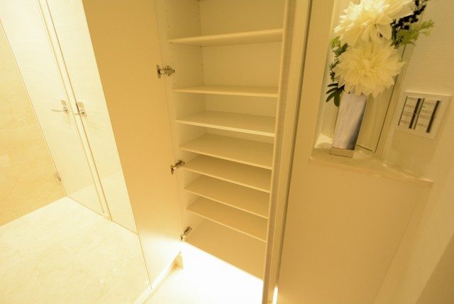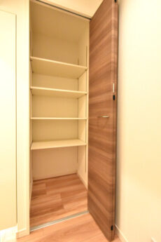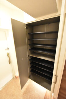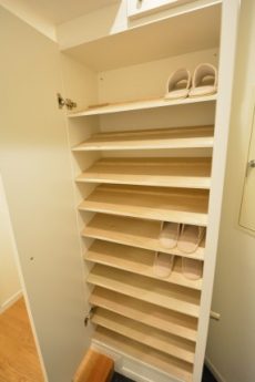 シューズボックスはトールタイプ。容量に余裕があるって片付ける上では大事ですよね。これで玄関はいつもスッキリ!ただし、濡れた靴は乾いてからしまいましょう。シューズボックスの隣には収納棚。奥行も十分でこちらも収納力抜群です。棚の手前には高さのある物も入れておけますよ。