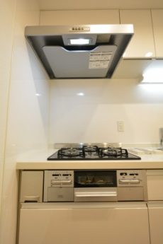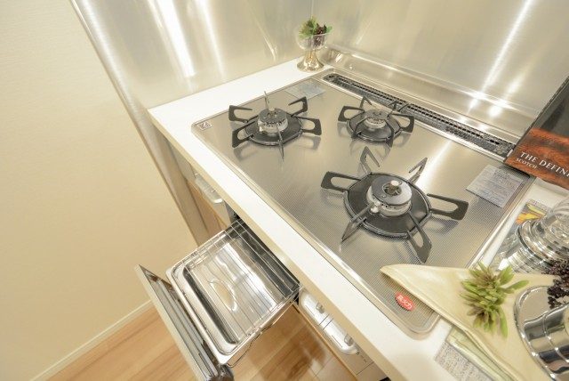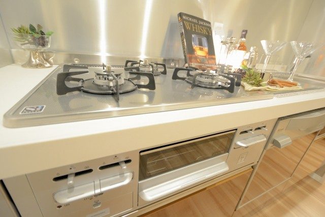 コンロは3口、グリル付き。温度設定やタイマー機能の付いた高機能タイプです。グリルは魚イメージが強いですが野菜や肉など何を焼いても美味しい優れもの。もっと活用していきましょう。その際は換気扇をお忘れなく。少し前から回し始めると効果的らしいですよ。