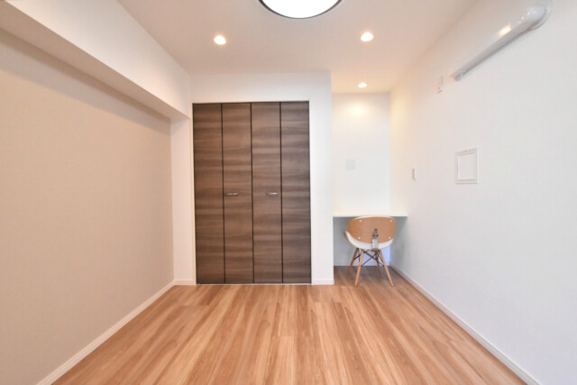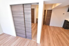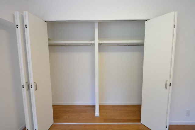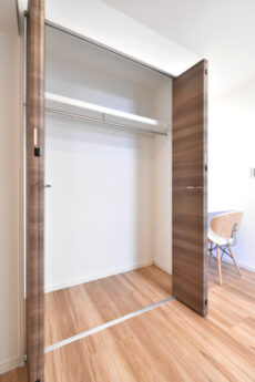 LDKお隣にあるバルコニー付きの洋室です。クローゼットを開けると3枚扉が連なって開きます。壁一面にあるクローゼットは収納力充実です。厚手のコートやダウンも余裕をもって仕舞えそうです♪