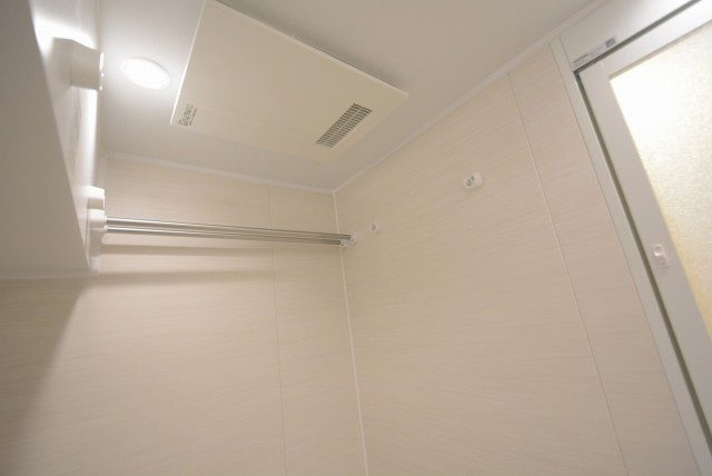 ストライプ柄の爽やかなバスルームです。浴室乾燥機も付いていて、梅雨の季節や寒い冬のひんやりしてしまった洗濯物などを干せたりと便利ですね。