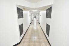 エレベーターで5階へ。広いエレベーターホールから内廊下をお部屋へ向かいます。100戸越えともなると廊下も長いですね。