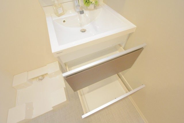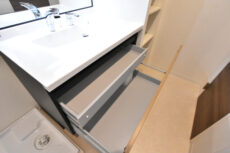 収納棚は洗面化粧台右側にあります。かさばるタオルや洗剤なども上下にわけて置いたりすると助かりますね。