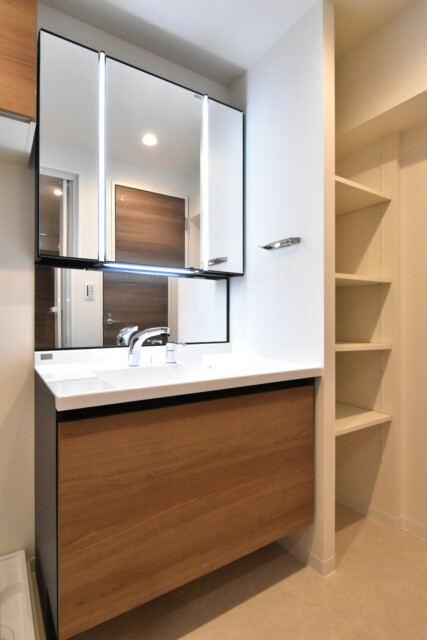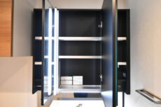 ブラウンパネルの洗面化粧台は三面鏡付。ミラーの間に付けられた照明で、影なく鏡を使えます。黒のラインがスタイリッシュな印象ですね。