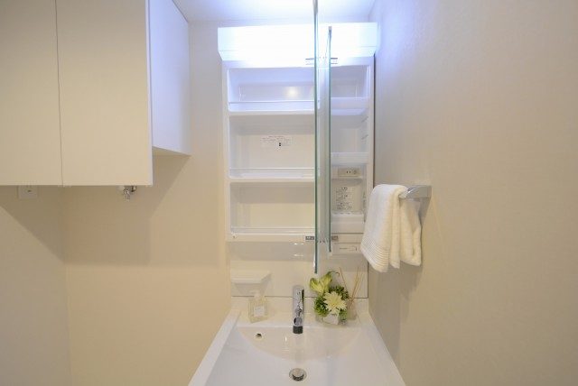 洗面化粧台です。大きくて見やすい三面鏡は扉を開くと裏側は全て収納!ゴチャゴチャしがちな洗面台、細々したものも収まりそうですね。洗面ボウル下の収納には引き出しもあり、仕舞いにくいドライラーなど置けると良いですね。真っ白な洗面台いつもピカピカにしていたいですね。