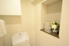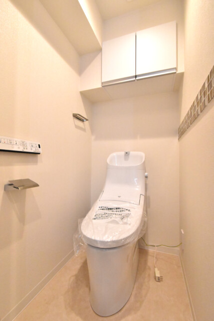 洗浄便座はINAX製のシャワートイレ。トイレットペーパーなどのストックに便利な吊戸棚も付いています。アクセントのタイルがオシャレですね。