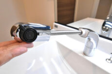 水栓はノズルが伸びるシャワー水栓。洗面ボウルを流したりに便利です。