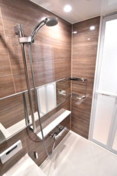 浴室は高級感のあるブラウンの鏡面仕上。落ち着いた雰囲気でリラックスしたバスタイムを過ごせそうです♬