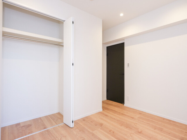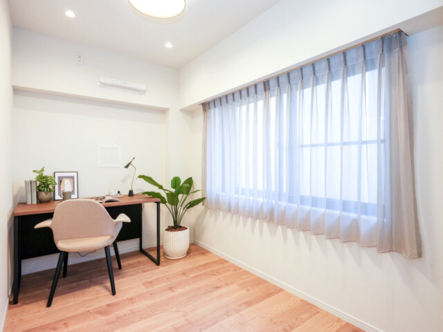 南向きの窓のあるお部屋です。洋室の中では一番コンパクトながら、入口にデッドスペースを作らない引き戸を使うなど広く使う工夫がされています。ベッドルームはもちろん、ご家族構成によっては書斎にするにもちょうどいいサイズ感ですよ。