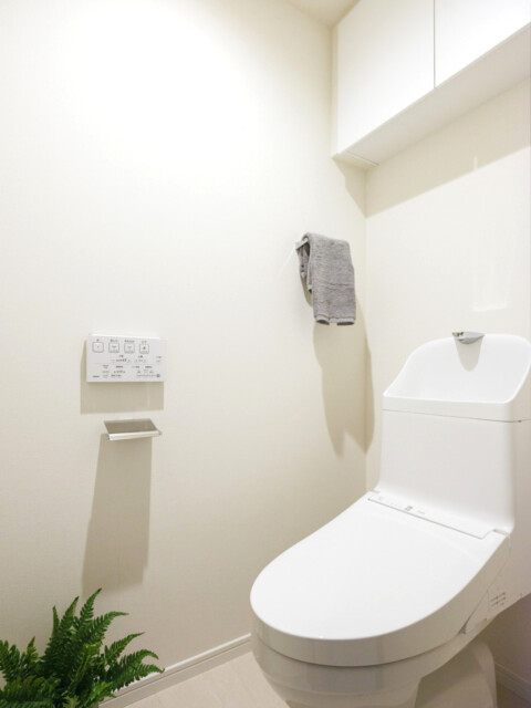 トイレはTOTO製の洗浄機能一体型。節水効果や汚れが付きづらい表面などお助け機能も満載です。掃除道具の収納やトイレットペーパーストックに便利な吊戸棚も付いていますよ。