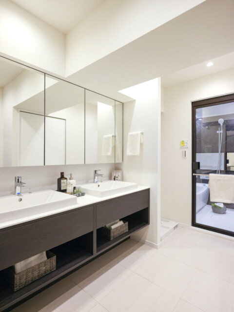 洗面室には洗面化粧台の他に、浴室、洗濯機スペース、リネン庫がまとまっていて脱衣所を兼ねています。洗面化粧台はゆとりの2ボウル!朝のラッシュ時に並んで使えるのは大助かりです♬ 洗濯機スペースには棚が設置されているので、洗濯洗剤などのランドリー用品はこちらへどうぞ。