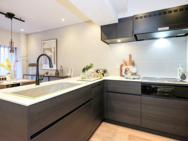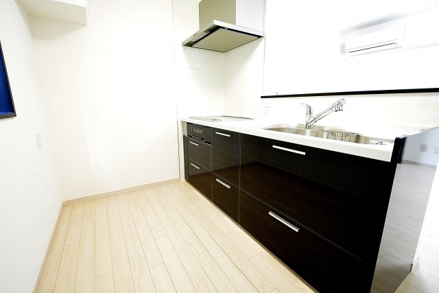 キッチン設備は浄水器付き水栓、3口IHグリル付き。