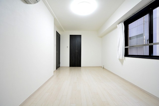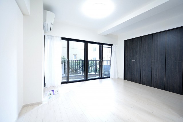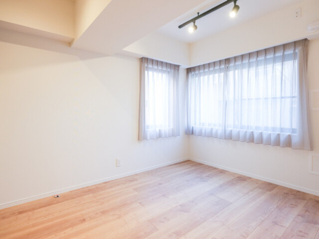 南・東向きの窓が付いた二面採光のお部屋です。洋室の中では一番大きくメインのベッドルームにお勧め。柱などによる出っ張りもなく、大きいサイズのベッドやベッド2台でも楽に置ける広さがあります。