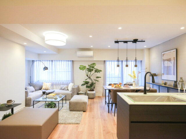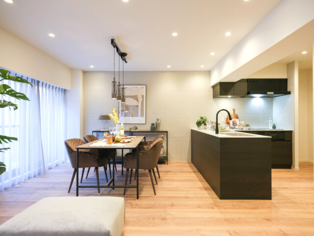 木目を生かしたフローリングにダークトーンのアクセントをプラスしたナチュラルモダン。家具小物は見本なので付いてはきませんが、ディスプレイしてあると生活のイメージがしやすくて助かります。サイズ感や色など参考にさせてもらいましょう。