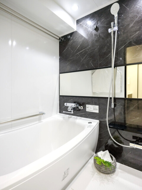 浴室は白を基調に大理石調のアクセントで高級感たっぷり。優雅な気分でバスタイムを過ごせそうですね。追い焚き機能が付いているのでご家族でお風呂の時間がバラバラになってしまっても大丈夫!いつでも温かいお風呂に入れます。雨の多い季節に嬉しい浴室換気乾燥機付き。