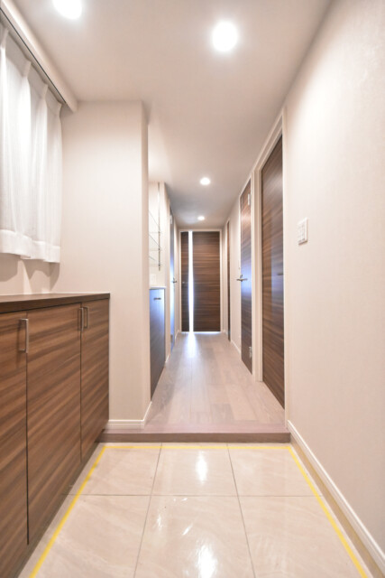 玄関から真っすぐ伸びた廊下は、ナチュラルカラーでまとめられた落ち着いた雰囲気。上り口は低く抑えられバリアフリーにも配慮されています。