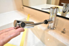 水栓はハンズフリー水栓。触ることなく水を出すことが出来ます。洗う前の汚れた手で触らなくていいのはまさに今の時代にぴったりですね。ヘッドが伸びるのでシンクを流したりにも便利ですよ。