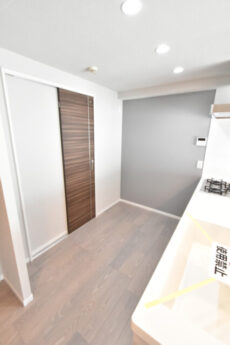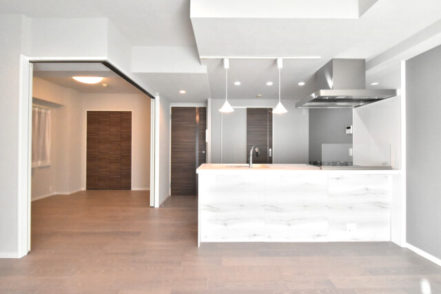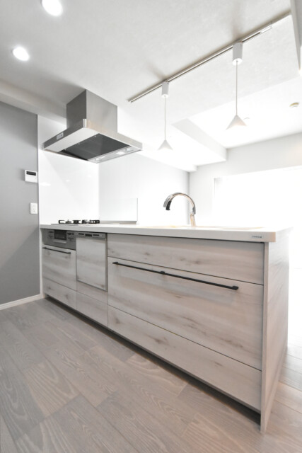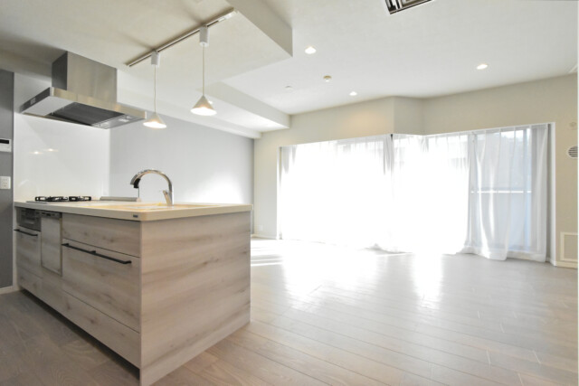 南向きバルコニーに面したワイドスパンのお部屋です。調理台に白木調のパネルを使っているのもあって今のところは真っ白なキャンバスのよう。これから家具やカーテンなどで好みの色に塗っていくという感じですね。階下に住戸がありませんので、小さなお子様がいるご家庭も安心です。