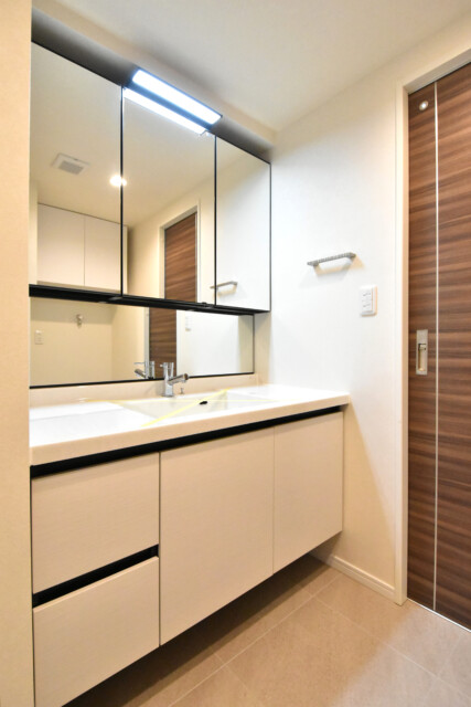 白を基調にした洗面化粧台は三面鏡付。上部に付けられた照明で影になることもありません。低い位置の鏡で小さなお子様も使いやすくなっています。これだけの幅があれば、朝のラッシュ時にも二人並んで使えそう。