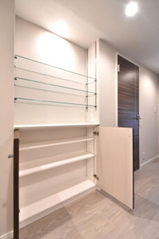 ちょっとこれでは靴が入りきらないという方は、廊下に並んだ収納もご利用ください。あまり履かない靴は箱に入れてしまっておきましょう。