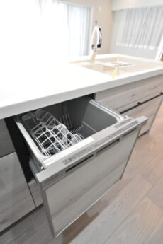 食器洗浄乾燥機!!!やりたくない家事の常連、食器洗いから解放されるなんて夢のよう。食後をみんなでのんびり過ごせるのも最高ですね♬ 引き出しタイプのスライドキャビネットは出し入れがし易く、たくさん詰めても収納物の確認がしやすい優れものです。