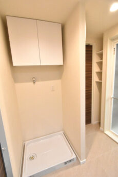 洗濯機スペースには吊戸棚も付いているので、洗濯関係のものはこちらへどうぞ。