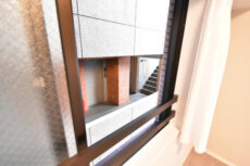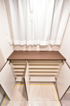玄関内にも吹き抜けに面した窓が付いています。日が入るのは季節時間的に限られるとは思いますが、換気目的だけでも助かりますよね。シューズボックスはロータイプ。上がカウンターになっていて、小物や写真などいろいろ飾ってインテリアを楽しむことが出来ます。キーやコインを置くのなら、洒落たトレイなど使うとインテリアにもなって一石二鳥ですよ。