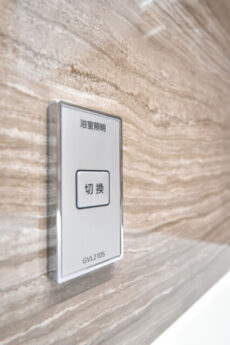 「切替」ボタンを押すと浴室の照明の色が変わります!今までのキリッとした感じから温かみのある雰囲気に。スミマセン、一日の終わりを過ごすなら絶対こっちですね(^-^;