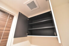 トイレットペーパーなどのストックに便利な吊戸棚付。カウンターの下にも収納があるので、掃除道具などはこちらへどうぞ。