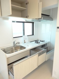吊戸棚と引き出し収納で調理器具以外にも食器なども収納出来そうですね。